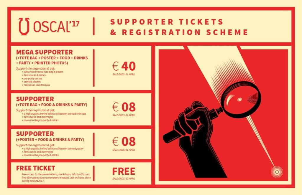 Duke zgjedhur një nga opsionet e biletave ju mbështesni financiarisht vullnetarët e ekipit organizativ të OSCAL dhe Open Labs Hackerspace. Dëshironi të regjistroheni për #OSCAL2017? Klikoni Këtu për të marrë biletën tuaj.