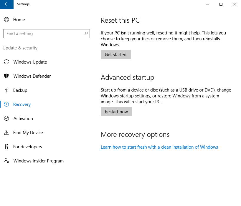 Mënyra më e mirë për të rikthyer Windows Registry në gjendjen e tij fillestare është duke përdorur opsionin e ndërtuar brenda në Windows të cilin e gjeni tek Settings>Update & Security>Recovery>Reset PC. Karakteristika Reset PC ju mundëson juve ruajtjen e të dhënave kur riktheni PC-në në gjendjen fillestare. Gjatë këtij proçesi vetëm programet dhe aplikacionet e palës së tretë do të hiqen.